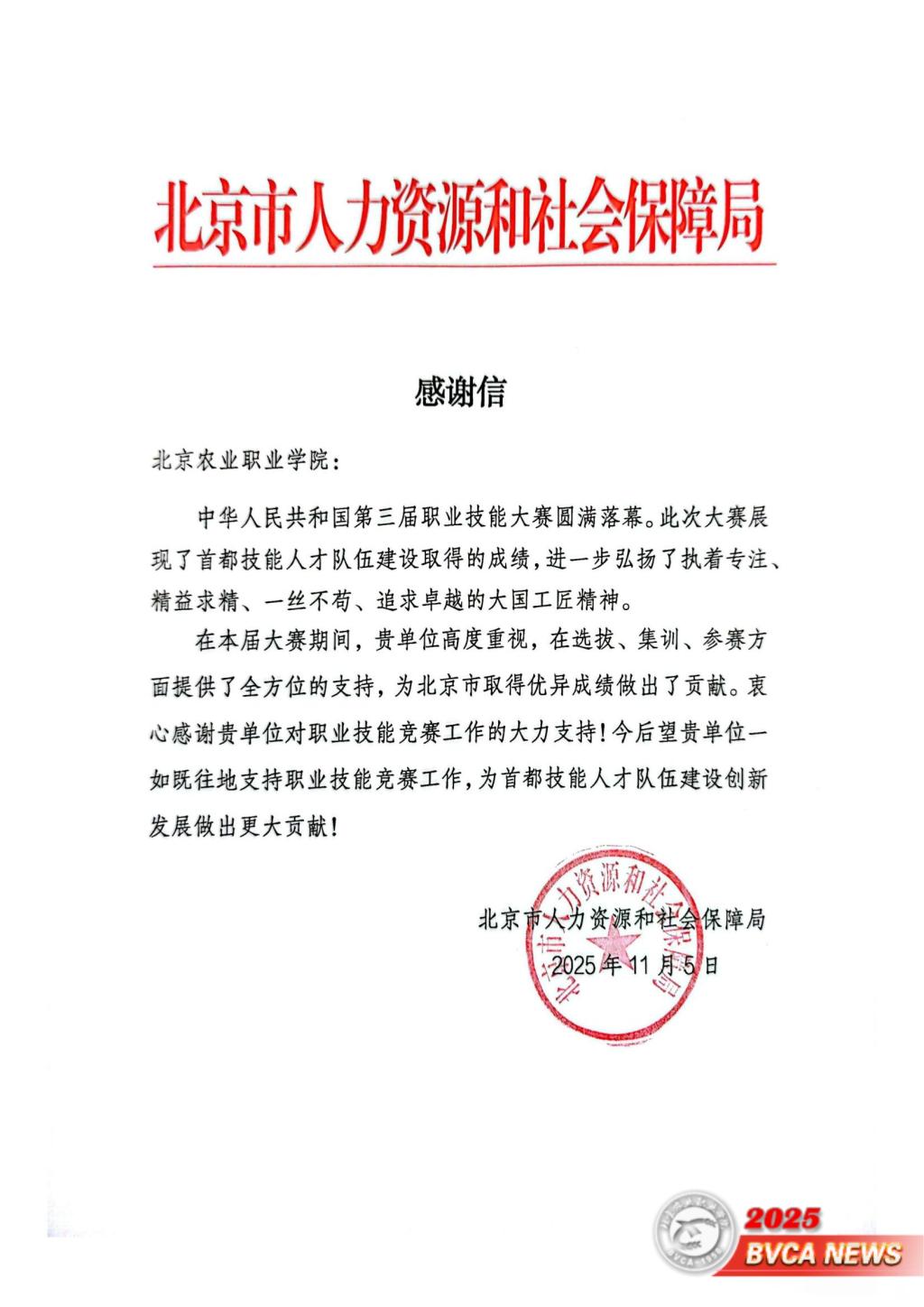 近日,北京市人力资源和社会保障局向我校发来感谢信,对我校在中华人民共和国第三届职业技能大赛所承担的农机智能化技术与砌筑两个赛项的技术服务工作表示高度认可与衷心感谢。
