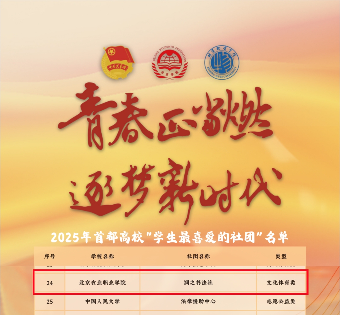 11月30日,由北京团市委、北京市委教育工委、北京学联等主办的首都高校学生社团展演暨2025年首都高校“学生最喜爱的社团”交流展示活动在北京物资学院举办。活动共选出6大类36个“学生最喜爱的社团”,我校润之书法社获评该荣誉称号。