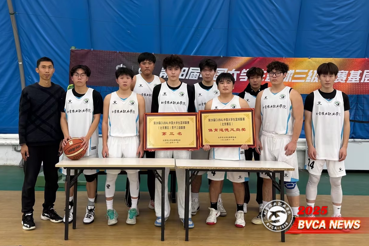 11月28日,第28届中国大学生篮球联赛(CUBAL)北京赛区三级赛事圆满收官。我校男子篮球队表现出色,斩获季军,第三次闯入赛区三甲,并获“体育道德风尚奖”。