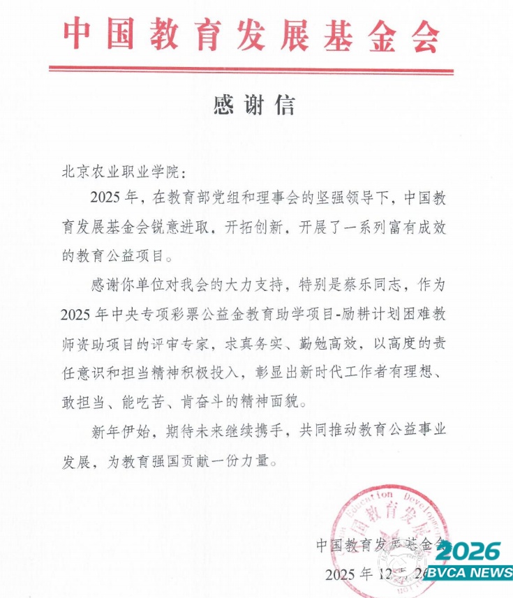 近日,我校收到中国教育发展基金会感谢信。信中对学生工作部蔡乐老师在“2025年中央专项彩票公益金教育助学项目——励耕计划困难教师资助项目”实施中的突出贡献予以高度肯定并致谢,认可我校资助工作。