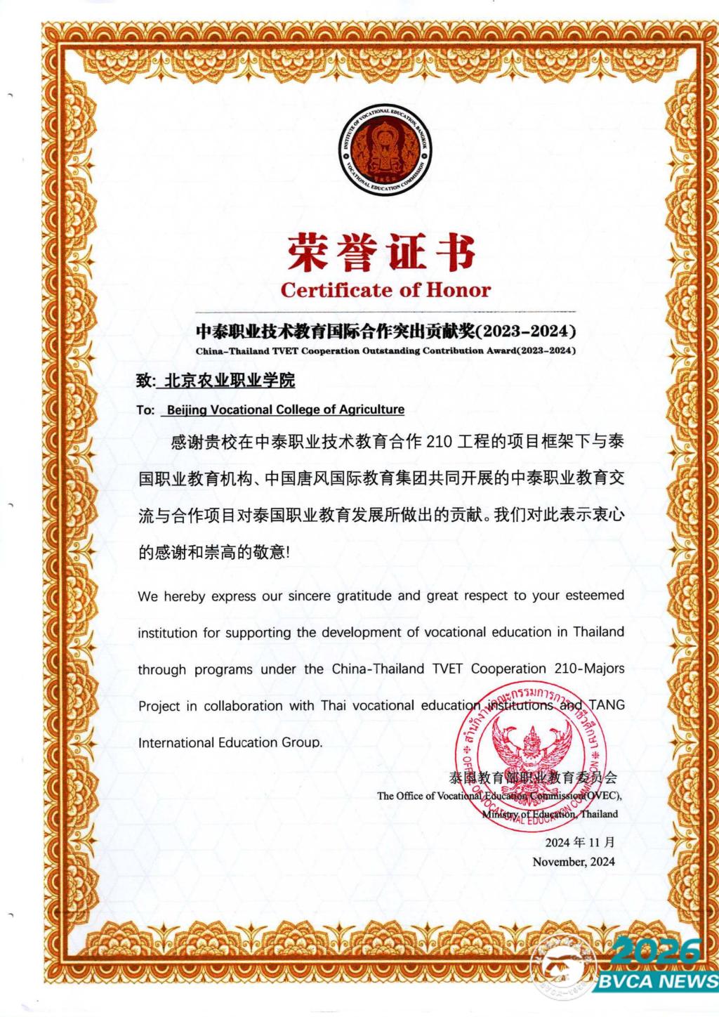 学校获中泰职业技术教育国际合作突出贡献奖