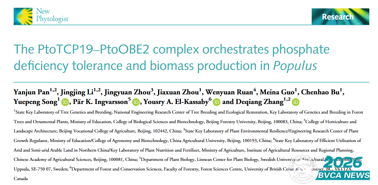 近日,我校张德强教授团队在New Phytologist(新植物学家)上在线发表了题为“The PtoTCP19-PtoOBE2 complex orchestrates phosphate deficiency tolerance and biomass production inPopulus”的研究论文。该研究通过整合树木生理学、群体遗传学与分子生物学等多学科交叉手段,精准鉴定了调控磷稳态与低磷耐受性的关键基因PtoTCP19,揭示了PtoTCP19-PtoOBE2复合物协同调控低磷耐受性与高产的分子机制。研究结果首次揭示了多年生木本植物低磷胁迫下提高植物生长量积累的分子调控机制,为耐低磷、高产林木新品种分子设计育种提供关键理论指导。