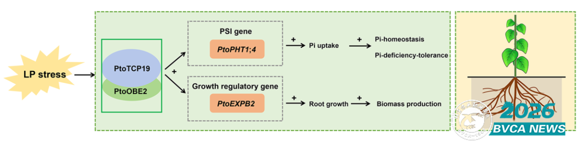综上所述,该研究系统解析了杨树协同调控低磷耐受性与高产的遗传调控机制,揭示了PtoTCP19-PtoOBE2复合体的双重调控功能,阐明了其通过分别激活PtoPHT1;4和PtoEXPB2表达促进杨树磷吸收与根系发育,协同增强低磷耐受性与生物量积累的分子机制,为深入解析木本植物在土壤磷匮乏条件的适应性调控机制研究提供了科学理论指导,为培育兼具耐低磷和高生物量的林木新种质奠定了重要理论基础。