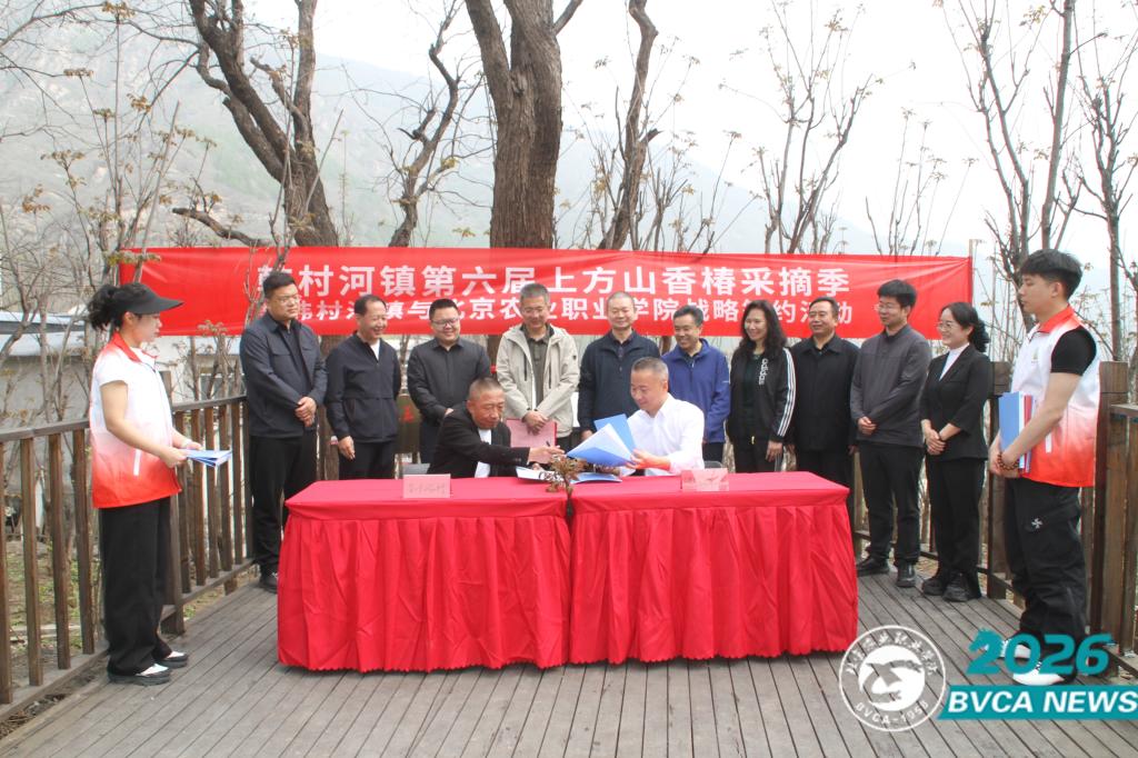 4月18日,韩村河镇第六届上方山香椿采摘季开启之际,学校与房山区韩村河镇政府在圣水峪村举行战略协议签约仪式。我校党委书记周志成,党委常委、副院长杨博,韩村河镇党委书记雒轶,党委副书记、镇长贾伟,镇人大主席梁明义出席仪式,仪式由雒轶主持。