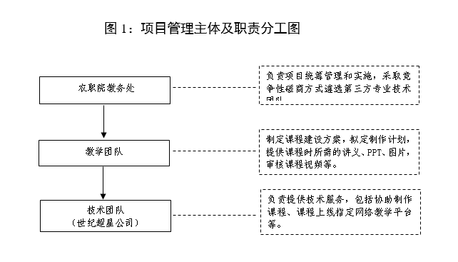 项目由教务处成立以教务处处长为项目负责人,并抽调骨干人员组成的项目团队,负责在线课程建设项目的统筹管理。师资团队方面,由农职院拟建设课程领域教学团队负责课程内容及环节的设计。技术支撑方面,教务处通过竞争性磋商方式,确定世纪超星公司为课程建设的专业技术团队负责在线开放课程视频录制、视频剪辑、字幕加载、特效制作、后期处理等技术部分工作内容。具体情况详见下图。