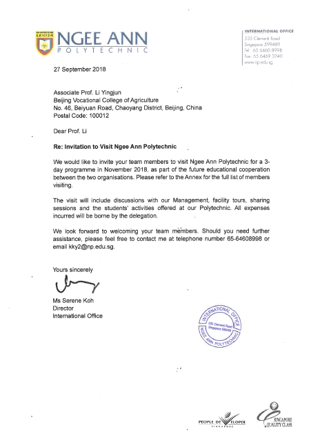 我院应新加坡义安理工学院邀请,拟于2018年11月21日-23日派出团组赴该院商谈拟合作开展的交流合作项目和短期留学生项目具体事宜,在外停留时间3天。相关信息公示如下: