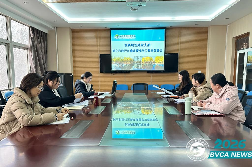 会议落实“第一议题”制度,集中学习了《中共北京农业职业学院委员会关于开展树立和践行正确政绩观学习教育的工作安排》《机关党委开展树立和践行正确政绩观学习教育任务清单》和《2026年机关党委工作要点》。强调要把学习教育与“十五五”规划编制、巡视整改落实等重点工作紧密结合,切实把学习教育成果转化为推动发展规划处各项工作高质量发展的实际成效。