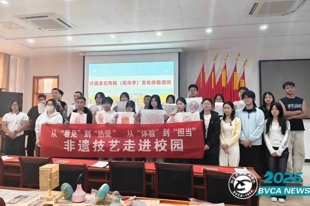 非遗传承人史德煜老师带着金石传拓(花鸟字)技艺走进校园,通过静态展览、技艺展演、实操体验三个环节,让师生感受传拓技艺的历史脉络与独特魅力,体会中华文字典籍之美。